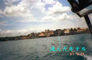 ペテン湖と言う湖のそばに有るフローレスと言う町に降りて、湖に浮かぶ周囲400m程の 島のホテルと言っても5−6部屋しかないんですがに部屋を取りました。 この島は何年か前の 地震で3−4m沈んでしまって、ホテルの一階は実は何年か前は2階だったのです。